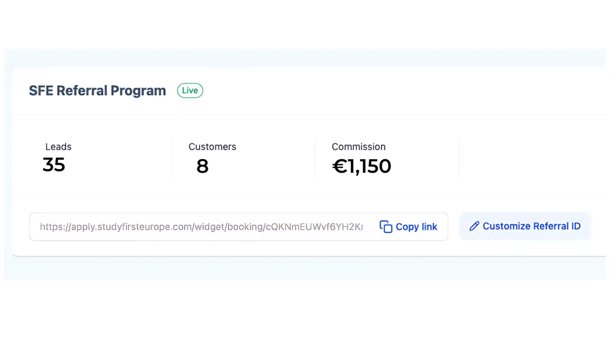 After submitting the application form, you will receive an email with your unique referral link and login credentials for your portal. You can start sharing your referral link immediately to invite friends to study in Europe with Study First Europe.